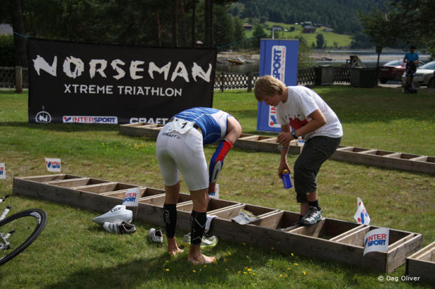 With the bike segment behind him, Tom Remman gets a bit of help getting his running gear on.