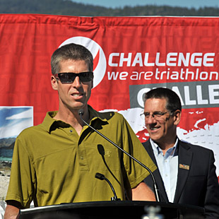 Peter: When I stopped racing triathlon in 2006, I became a pilot and I was no longer coaching or affiliated with triathlon any more. For a few years I have had very little contact with the sport. About two weeks ago I was approached by Challenge. I had no idea what was going down in Penticton. They just contacted me out of the blue. They said Peter we'd like to get you back into the sport in an advisory role. To get the community and the athlete back into the sport. I thought 'Y'know, I am kinda happy with my life right now. I am not really looking at getting back into the sport particularly. They said 'Well, can you be in Penticton next Thursday?" I said ''Sure, I'll take Skype calls. I'll take a conference call. Sounds good to me.' But this Monday they tracked me down at work and said 'Peter we need you in Penticton. Right away.' I got goose bumps. I asked is what I think it is?' They said, 'We can’t tell you anything. But can you be in Penticton?' I said 'Absolutely. I want to be a part of this. I want to bring back this event to be one of the best events in North America.' We already have the best course. We already have the best volunteers. I want to help make this the race I first saw on TV in 1989. So I came here on my own time. I took a couple of days off to be here. I am very excited about what is happening here in Penticton. This is very good for this event!