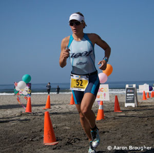 Warriner, Cave, Ellis and Groff all hit T2 together, with Belgian Tine Deckers two minutes back and Carfrae three minutes down. While confident in her off season rest and her recent hard training, Carfrae had moments of uncertainty that she might reprise her nightmarish sluggishness at Clearwater. “I remember feeling bad that race and riding right behind Dede Griesbauer and thinking I should get going and pass her,” said Carfrae. “But when I tried , I had nothing left and I couldn’t get past her in the time allotted and got a deserved penalty.” This day, Carfrae got within 2 minutes of the bike leaders, then faded back to three minutes and change by T2. Still, her deficit was nothing like the 6 minutes she had to overcome on the run to win the 2007 Ironman 70.3 World Championship in Clearwater.
