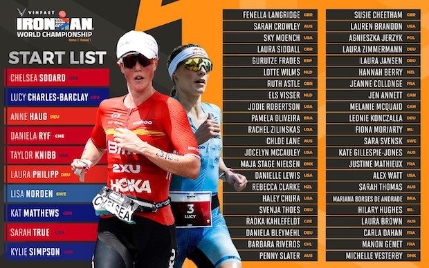 Defending champion Chelsea Sodaro will look to repeat her performance in the inaugural pro women only race. Perennial podium finisher Lucy Charles-Barclay will have bib #2, with former champion Anne Haug taking #3. Daniela Ryf, looking to earn her sixth IRONMAN World Championship, is #4, and will-she-or-won't-she Taylor Knibb appears to be making her IRONMAN debut, appearing on the start list at #5.