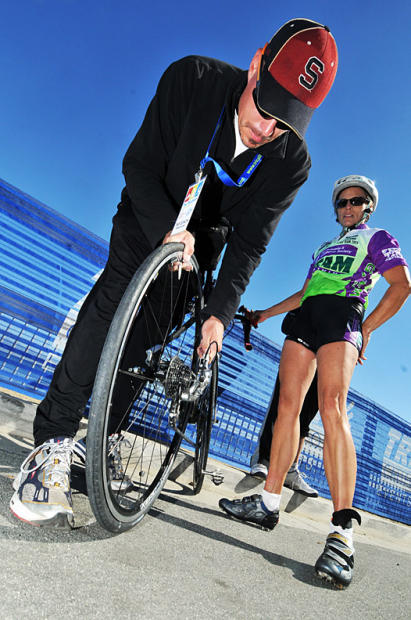 This swift age grouper’s blue and white spandex and bike is a perfect match for the sparkling blue, backlit Pacific and a low line of puffy white clouds.