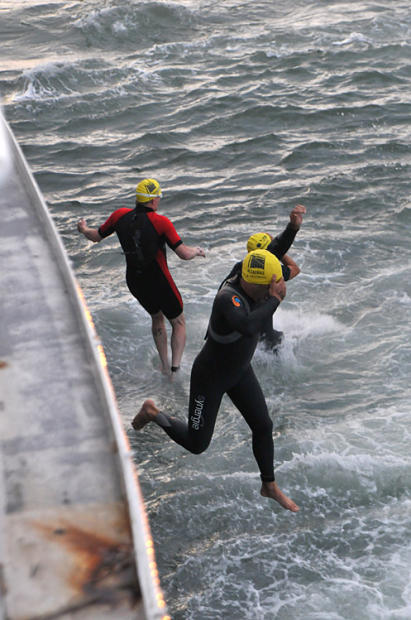 This is what the digital age has brought us: Alcatraz swimmer records himself, at the moment of takeoff, with his waterproof digital camera.