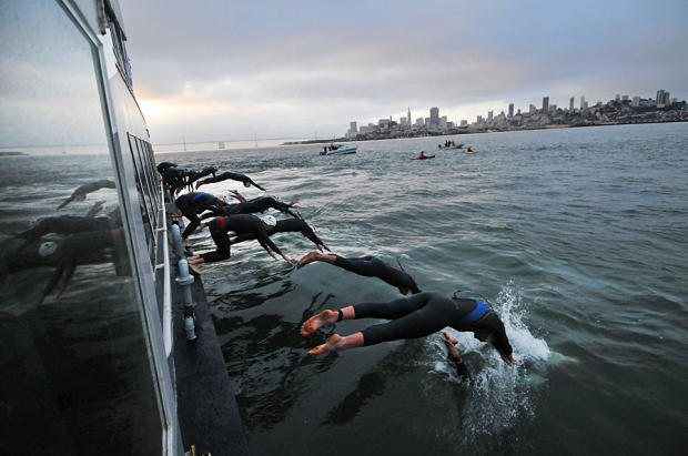 The pros dive into the Bay at 7 AM with the San Francisco city skyline as an unforgettable backdrop.