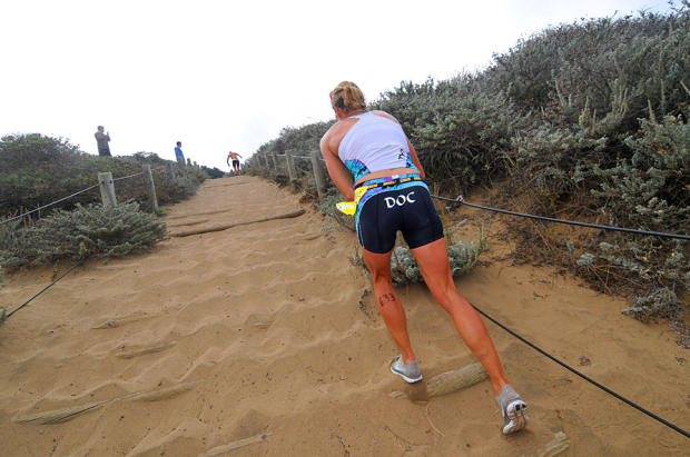 This shot looks like the agony of defeat, as two women warriors slog up the steep sand ladder. Actually, this was the moment of truth as Tenille Hoogland charged past Amanda Stevens for the lead.
