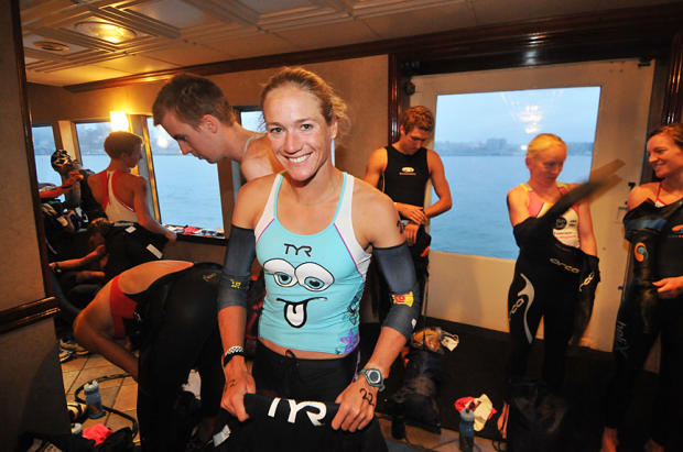 Amanda Stevens and fellow pros get ready while the ferry cruises to the start off Alcatraz Island.