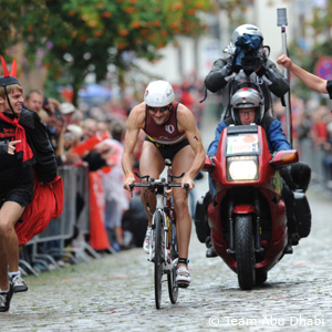 Vanhoenacker stuck close to the lead pack in the swim. On the bike., Vanhoenacker and Kienle broke away as the Ironman record holder seemed to thrive in Belgiumesque rain and arrived in T2 with a 3:05 lead on Kienle, 11:03 on Jan Raphael, 11:05 on Stephane Poulat, and 12:10 on 2010 champion Andreas Raelert, who throughout the race was hampered by stomach troubles that led him to the toilets several times.