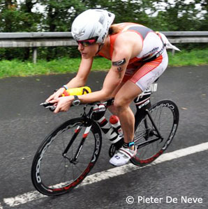 Yvonne Van Vlerken was next into T2, 12:36 later, but back problems forced the Dutch champion to withdraw in the run. Sophie Goos was 4th to T2 in 6:02:00, Susan Dietrich 5th in 6:03:22, Amanda Stevens 6th in 6:06:41, Mareen Hufe 7th in 6:07:11, Corinne Abraham 8th in 6:11:48 and Heather Wurtele 9th in 6:16:23.