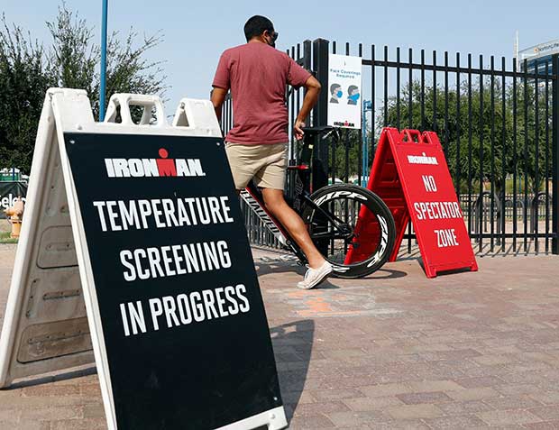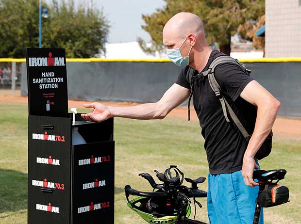 “All participants received an e-mail from Active.com where you selected a one hour window on Saturday to bring down your bike and do registration. My wife and I selected 9-10am, the second hour time slot available (they began at 8am). As we approached Tempe Beach Park and the Athlete Village, we could immediately see there was control over the flow of pedestrian traffic with staff at the various entrances, with hand sanitizer and enforcing the mask requirement to enter.