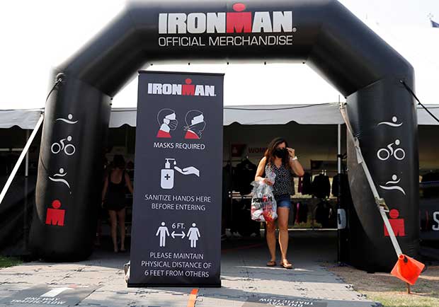 “The swim, T1, and the bike were all perfectly normal. I didn't use either of the bike aid stations but volunteers in masks were behind the tables offering to hand you a bottle or nutrition but it was incumbent on the rider to stop—no flying hand-offs. On the run the tables were set up with the traditional rhythm of water, Gatorade, Red Bull, Coke, Water, Ice. Again it was up to the athlete to pick up their own nutrition, the volunteers stood back and kept the tables stocked and directed you to the table with whatever you requested. Once finished, you removed your own timing chip, picked up your medal yourself, and provided another mask to exit.