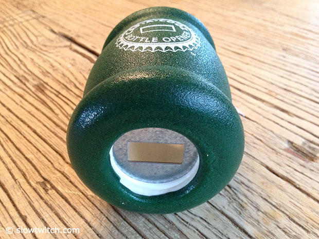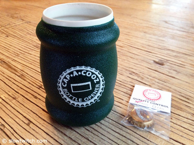 When turned on its side you can see the bottle opener in the Cap-A-Cooz.