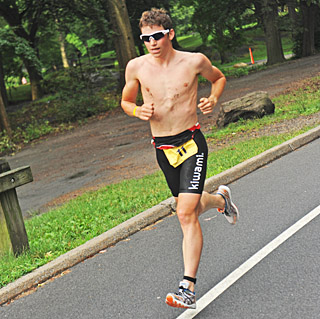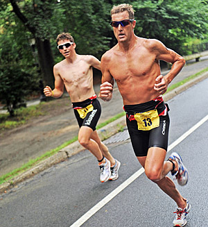 Andrew: I went up against David Thompson last year and this year at the Philadelphia Triathlon. It was the same scenario both times. I had about 1 minute on him in the swim. I outrode him by 45 seconds and had a 1:45 advantage going into the run. Then he ran me down and passed me at mile 5. [In 2008, Yoder out-biked Thompson 53:41 to 56:00; in 2009 Yoder out-biked Thompson 55:32 to 56:26. In 2008, Thompson ran 33:52 to Yoder’s 35:48; in 2009 Thompson ran 33:45 to Yoder’s 36:35] Both years, same story. Last year seemed like a better result for me. This year I was disappointed.