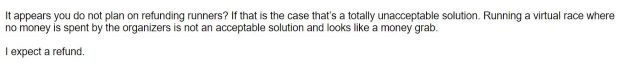 For Quarter Marathon, we offered runners a 50% off coupon to a future event. We didn't feel it was fair for the athletes to bear the total burden of the change in event. But we also needed to be as fair as possible to our vendors.