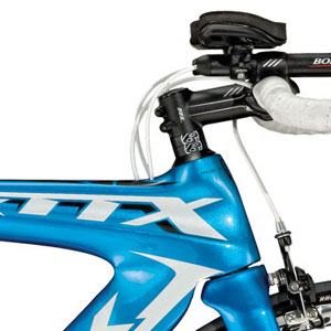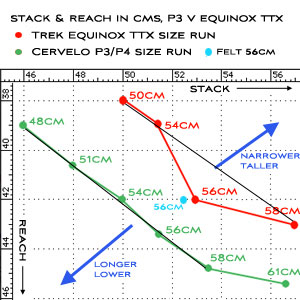 The Equinox TTX, on the other hand is a narrower/taller bike. For example, the 54cm Equinox is 3cm "narrower," that is to say, the head tube top is 3cm back toward to the bottom bracket (39cm reach versus the P3's 42cm reach for this same 54cm size bike). But it's also taller, by 1.5cm (51.5cm stack to Cervelo's 50cm stack).