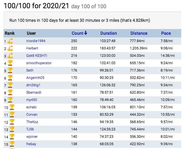 This is the spirit of this Challenge, and this year 723 officially took part, versus 726 last year. There were 152 this year who completed 100 runs in 100 days, versus 144 last year. There were 227 this past year who completed at least 70 runs, versus 221 last year.