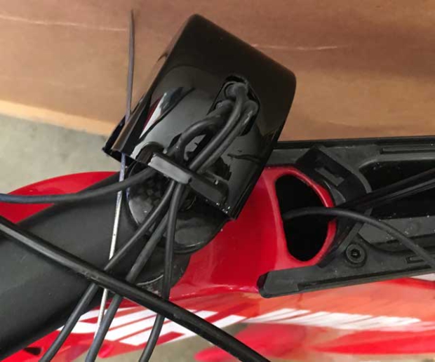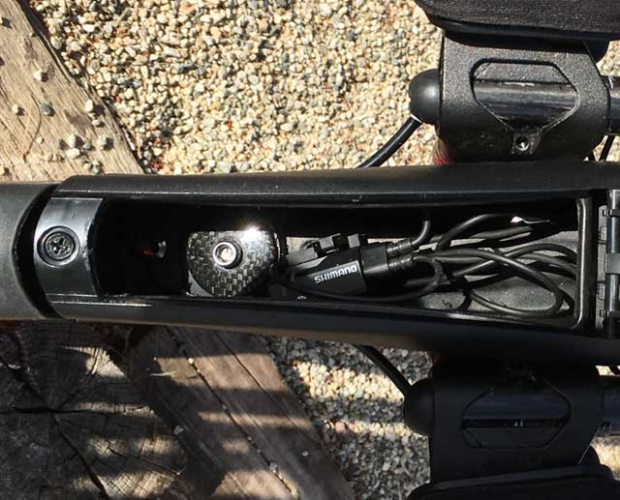So, when I talk about engineering marvels, how cool was that nose piece? The junction box didn’t just sit in there. It clipped in there. I wish there was a way to have preserved that nose cone for the new stem. Alas, where now the junction box? I drilled a couple of holes in that front storage box, on one each lower front quadrant, and routed the Di2 cables in there. I put the junction box in there.