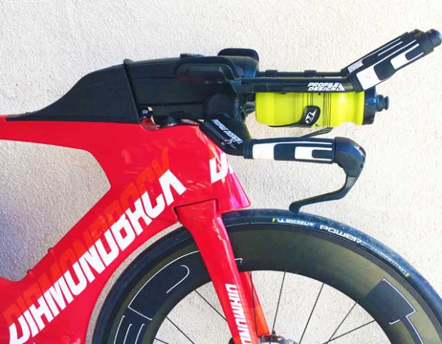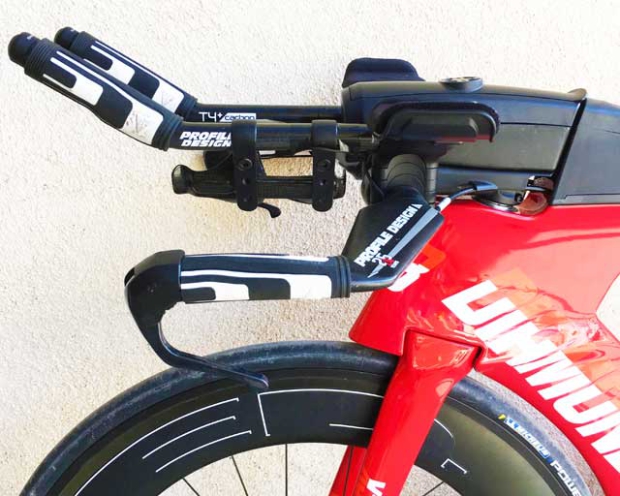 I’ve now got a Profile Design Supersonic bar on this bike. Using the old stem and Cobra aerobar the way this bike used to adjust up or down was by aero headset spacers, sort of like the Cervelo P5-6 with the 3T Aduro bar. I was not overfond of this motif. I much prefer just using the pedestals in the aerobar if I need to go higher. As you see from the shots of this bike, I’ve got 30mm of pedestals under my aerobar, but this didn’t change the orientation of the storage units.