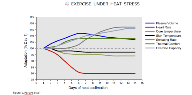 The physiological changes we can use to our benefit are going to be gained during daily life and race preparation in extreme environmental conditions – whether through exercise or at rest, but you will trigger the most effective adaptations during exercise in hot and humid conditions that gradually progresses in exposure.1 Post-exercise heat immersion in a sauna for 30-40 minutes can also be quite effective.1 Heat adaptations appear to benefit performance in all environmental conditions1, and if you can’t get the benefits of living at altitude, then the benefits of doing focused heat work are a pretty decent consolation prize. This figure summarizes a typical timeline for the various adaptations associated with heat adaptation.