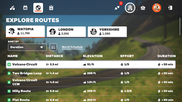 Tracking your badge hunting is easier now than it has been in the past. The new menu features a sortable list with green icons indicating if you earned the badge for each course. Access this sortable list by clicking on the World icon at the top for Explore Routes. Not very prominent on this page is the popup link to the World Schedule just below the current Worlds tabs. Additionally, you can still see your route badges under the Badges icon at the top of the menu on the right.