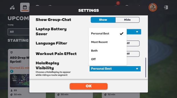 You may have noticed that a ghost of a former version of you shows up on particular courses and segments. These ghosts are replaying an earlier effort you made down to the detail of what equipment you used and when you were sitting and standing. They can be deceptive, though, because the effort that the HoloReplay is using may or may not have been in a group, and the current effort you are comparing to may or may not be assisted by drafting or powerup. You can adjust the settings of the HoloReplays by clicking on your circle icon in the upper right of the main menu and selecting My Settings. If you scroll to the bottom, you can choose among Personal Best, Most Recent, Both or Off.