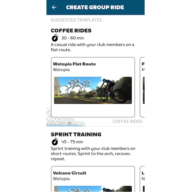 If this seems over complicated to setup, Zwift has suggested templates in the Companion App for hosting Club Events, including Coffee Rides, Sprint Training, Long Steady Distance, and Badge Hunting. Your bike shop, organization, or team may want to start with a template and then make changes based on how it goes.