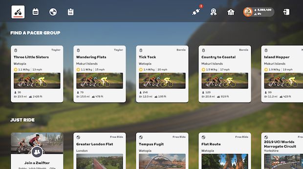 Pace Partners have been renamed as “RoboPacers,” and are easily available on the main menu when you log into the game. Scroll down to the fourth row of the main menu, and you will find the “Find a Pacer Group” options where the RoboPacers are listed in order of watts/kg (and color of w/kg category: yellow, blue, green, and red). Note that the route details are listed as well as the current size of the pack following the RoboPacer.