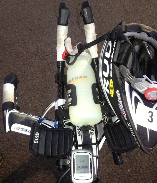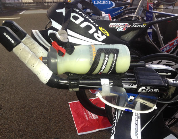 Sitting between PRO Missle Evo aerobars was XLAB's Chimp front bottle cage with an undisclosed concoction in Dye's Nathan branded bottle. The Rudy Project glasses are held in place with a piece of athletic tape tied to his aerobars.