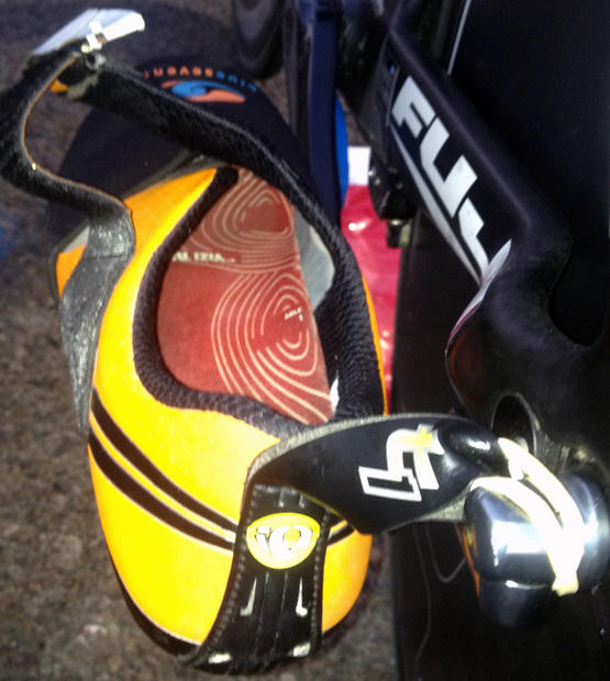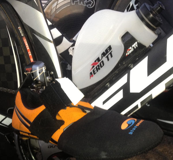 Dye stayed hydrated with a XLAB Aero TT hydration unit. His Pearl Izumi T1 shoes had Blueseventy toe warmers due to the cool morning temperatures in Oceanside.