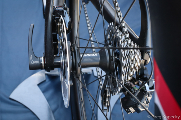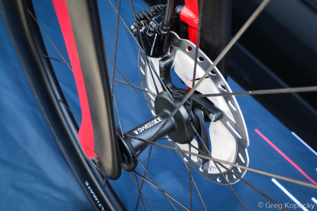 Swiss Side Hadron carbon clincher wheels handle the rolling duties. This aero-focused brand collaborates heavily with hub expert DT Swiss.