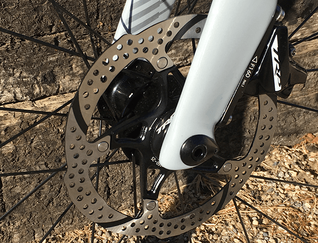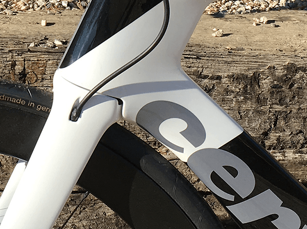 Our Reader Forum just about lost its cookies over the exposed front brake cable on this bike. Oh, the horror! I have another tri bike in my workshop that has a front hydraulic disc brake and its routing is much cleaner! The cable disappears down the steerer, traveling the entire length of the fork, exiting right where the brake caliber is. Sounds great! Until you need to get at the steerer (to take out pedestals or add them in or whatever you want to do). Cervelo learned a lesson with the old P5-6: To raise and lower the aerobars you needed to decable the bike, because the cables ran through the headset spacers (the only way to raise and lower the armrests on the old 3T Aduro aerobar).