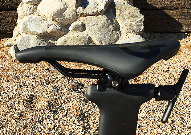Cervelo almost screwed the pooch here. It spec’d a Prologo Dimension Tri T4.0 saddle, and that’s a fine saddle. But it’s not a split nosed saddle and on a saddle like this you’re riding atop the saddle rather than in front of it (hooking your ischial tuberosities on the twin noses). That means you have to push this type of saddle further forward, and on this saddle – with a truncated nose, following the theme of the Specialized Power Saddle – you have to put the saddle even further forward.