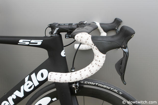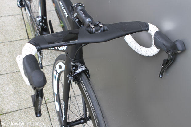 But from the front and slightly above you can see the differences well. Cervelo claims a 4.4 watts savings from the bars alone, and 21.3 watts on the complete bike compared to the previous S5VWD.