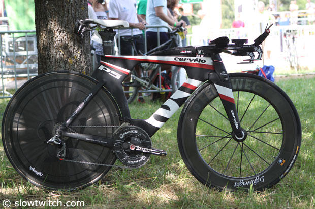 Bachor's Cervelo P5/6 in transition the day before the race, but not yet in the slot.