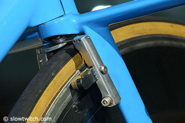 Custom English Cycles aluminum brakes are hidden behind the fork.