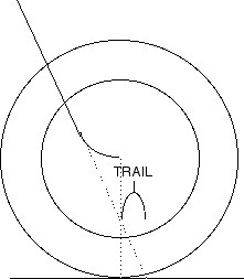There is a fancy formula for generating trail, but it's easier to understand if you look at a diagram. In order to have "trail" the front wheel’s contact patch—the place where the rubber literally meets the road—must fall behind the point where the bike's steering axis would (theoretically) meet the road. The further the contact patch falls behind the steering axis, the more trail there is and the more likely the bike will want to go in a straight line. The degree of the bike's determination to steer in a straight line equates to it's "sluggishness" as well as it's "stability" and "predictability," all words which represent different sides of the same coin.