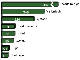What a statement of tenacity, when you consider that in 1999 this brand had 340 aerobars in the race, less than half of what Syntace had. This year Profile Design enjoys almost that same level of dominance of second place Visiontech. Syntace is in third, but is existing on fumes. Many of the Syntace bars in the race have been on the same bikes for years, and the "new" Syntace models look curiously like those made 15 years ago.