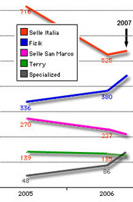 Terry's women's saddle, which enjoys popularity in pockets among women, is losing ground to these other specialty saddles like Profile and Blackwell as well as to Fizik.