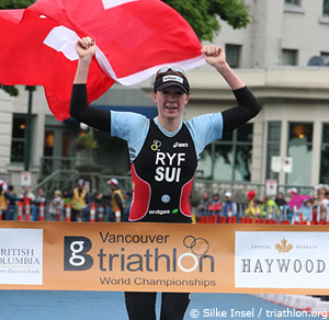Alistair Brownlee (GBR) held of defending champion Gregor Buchholz (GER) at the 2008 ITU Triathlon World Championships in Vancouver, BC and took the U23 title. Wearing bib #1 just like Alistair Brownlee did in the men's race, Daniela Ryf (SWI) snagged the U23 women's title.