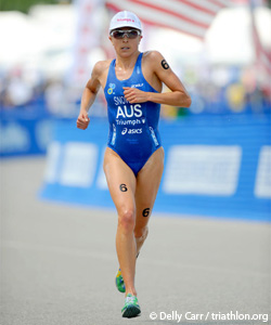 McLarty rode by herself for the first lap and a half before a strong chase group that included Emma Snowsill, Laura Bennett, Emma Moffatt, Julie Ertel and newly crowned world champion Helen Tucker reeled her in. These ten women worked together well and slowly added time to their lead. By the time the arrived at T2 they had a 2-minute cushion on the closest pursuers.