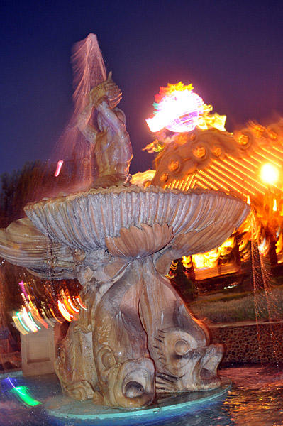 Roman gods wrestle spitting fish in Parisienesque fountain