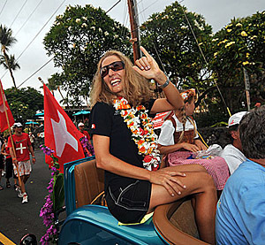 At the end, Wellington proved more than equal to the task of defending her championship. During the week, she embraced the crowds, stopping to take pictures with anyone and everyone, mugging happily like the reincarnation of Carol Burnett and Lucille Ball at the press conference. And, in an era in which nervous contenders most resemble bug-phobic Howard Hughes to avoid even shaking hands with strangers lest they get a cold or a stomach ailment on race day, Wellington kissed babies and adults and children left and right on Alii Drive the week before the race.