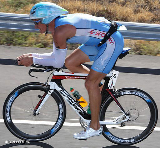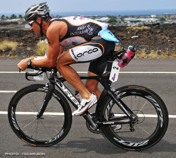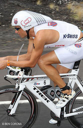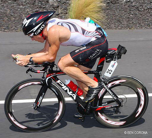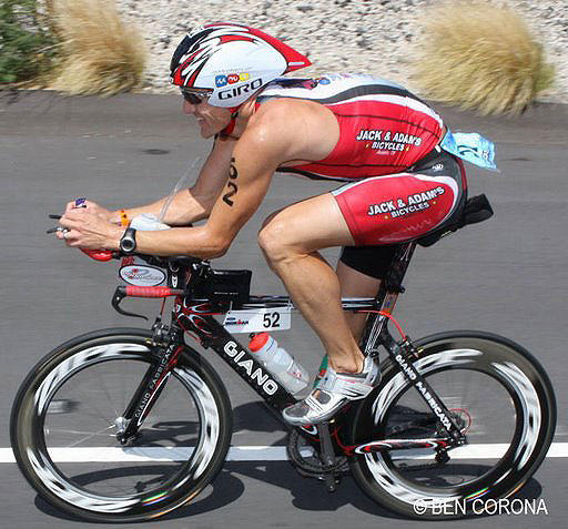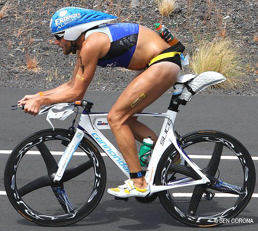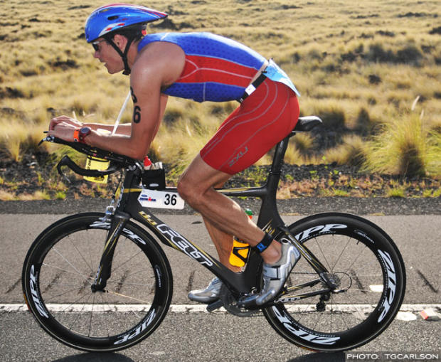 Chris Lieto, one of triathlon's best cyclists, comes from a cycling background and retains a more rearward saddle position.