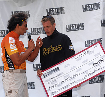 Greg: Now Laura comes back from Beijing and she is very sick. A lot of athletes came back with a flu virus from the Olympics. I got it as well, and that made it tough going into the LA race, the 4th of the series. Again, I was feeling as I did at Chicago. Man, I should not be here, but in Life Time Fitness, you must start all the races. Although you don’t need to finish. I was really sick, coughing up phlegm balls. I could not make it a running race as I had to keep my heart rate low, and I had to power the pedals in a big gear on the bike to keep my heart rate down, otherwise I could not breathe.