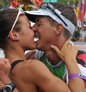 Mathias: Greg really prepared me well for that day. He gave me the confidence and the right advice how to race on that day. My swim was all good. I came out of the water exactly where I wanted and I was in the main pack with all the main contenders. The first k’s on the bike are always very hectic and I just tried to keep cool and wait until the pack gets smaller and smaller. One after the other couldn’t follow the pace anymore and on the way up to Hawi I found myself between guys like Macca, Crowie, Normann, Eneko, Timo, Cameron and other big names. That’s a really good feeling for a no name like me. Greg went through every situation with me and I always felt confident and patient out there. I kept riding with Crowie and Cameron. Timo and Eneko were not much in front. I thought that’s the pace I can handle. At the end I was even riding a bit away from Crowie and Cameron. But it took me forever to but my compression socks on in T2 and I ended up running out of transition behind them. I couldn’t have followed them for long anyway. But it would have been a good feeling to start the run with them. I felt really bad on those first 10-15k until I was out of town. Ronnie, Patrick and Rutger passed me and I tried to find a good rhythm. I was lucky that a few of the big names in front of me started to get slower and I was able to keep my pace up and finishing strong. So after the energy lab I found myself running on 9th place together with Andy Potts. Andy and I ran the whole way back together. I thought if I want to beat him, I have to “attack” before going down Palani road. It didn’t work, but I was more then happy finishing 8th behind him. Greg was standing on Alii drive and I could see he was as excited as I was about my race. But the best thing was to see my girlfriend Nicole waiting for me at the finish line…with a BIG smile on her face.
