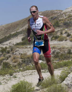 The bike course in the Nevada desert had lots of steep one and two-minute climbs followed by quick descents, and the South Africans Conrad Stoltz and Dan Hugo quickly charged into the lead. They were hotly pursued by American Josiah Middaugh who had lost very little time to the leading men during the swim and was thus in a very good position. Middaugh first flew by Hugo and a short while later caught and passed Stoltz too. He carried a small lead into the second transition and now it came down to a battle on the run.