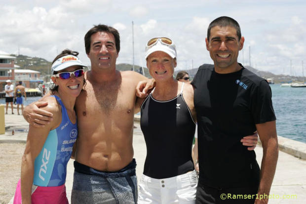 Lisa Bentley with husband David Cracknell, Jo Lawn and Armando Galarraga the day before the race.