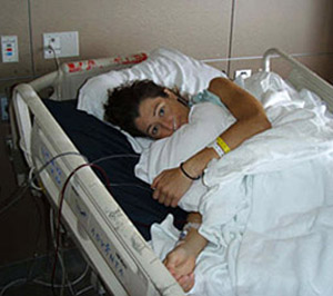 The ovarian cancer specialist did another exam. He though the same thing without saying it. He wanted to do a laparoscopy – which is not very invasive. They make two small incisions and take a tiny sample of the large mass to test. At this time they did not call it a tumor. The doctor was only supposed to go in and take a small sample. It should have taken a couple of hours, not an overnight thing. But he found that the mass was encrusted by blood vessels growing around it when he took a piece. I started to bleed really badly so they cut me open to stop it.