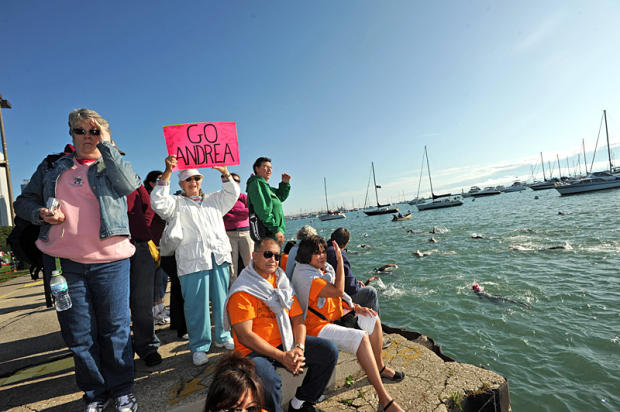 Friends and family get a front row seat on the seawall to cheer on their favorite triathletes.