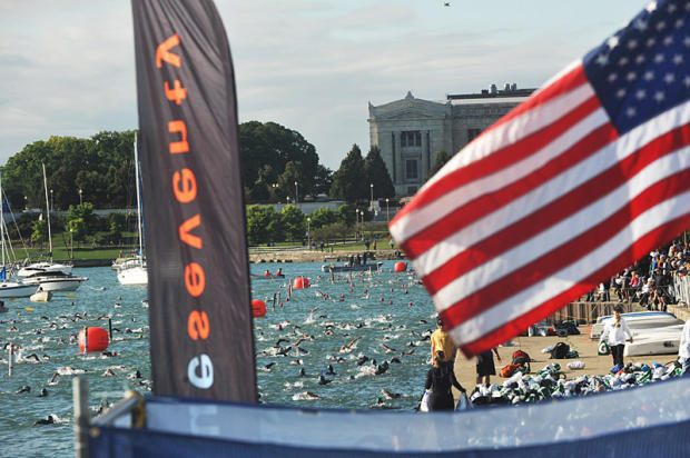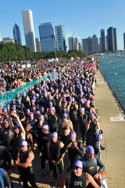 The signature vista of the Chicago Triathlon: Monroe Harbor and a ring of high rise condominiums and office buildings invaded by thousands of triathletes.
