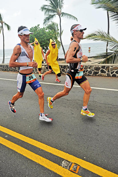 Pete Jacobs (8th place – 2:57:13 marathon) and Dirk Bockel (7th place – 2:57:41 marathon) are coming and going at St. Peter’s Church about Mile 4.5 on Alii Drive. They finished just 20 seconds apart