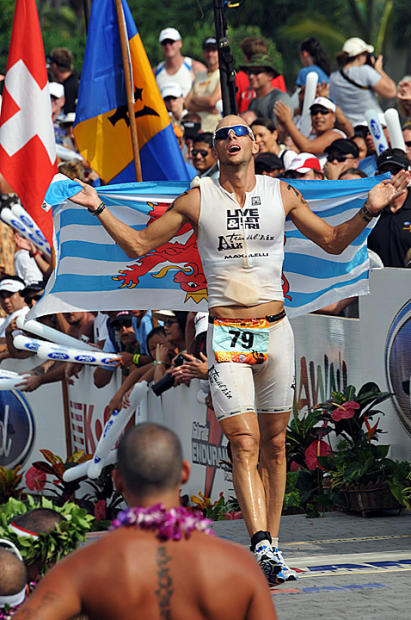 If this weren’t the Ironman Hawaii finishing chute, Christian Brader of Germany might have been asked to take a breathalyzer test. Here he is wobbling in at 26th place in 8:57:39.
